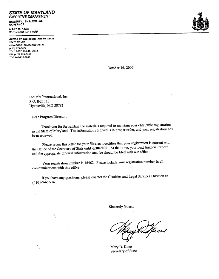 Uzima International's tax exempt ID number is 17053276023005. Uzima International is registered in the state of Maryland (copy of official registration).